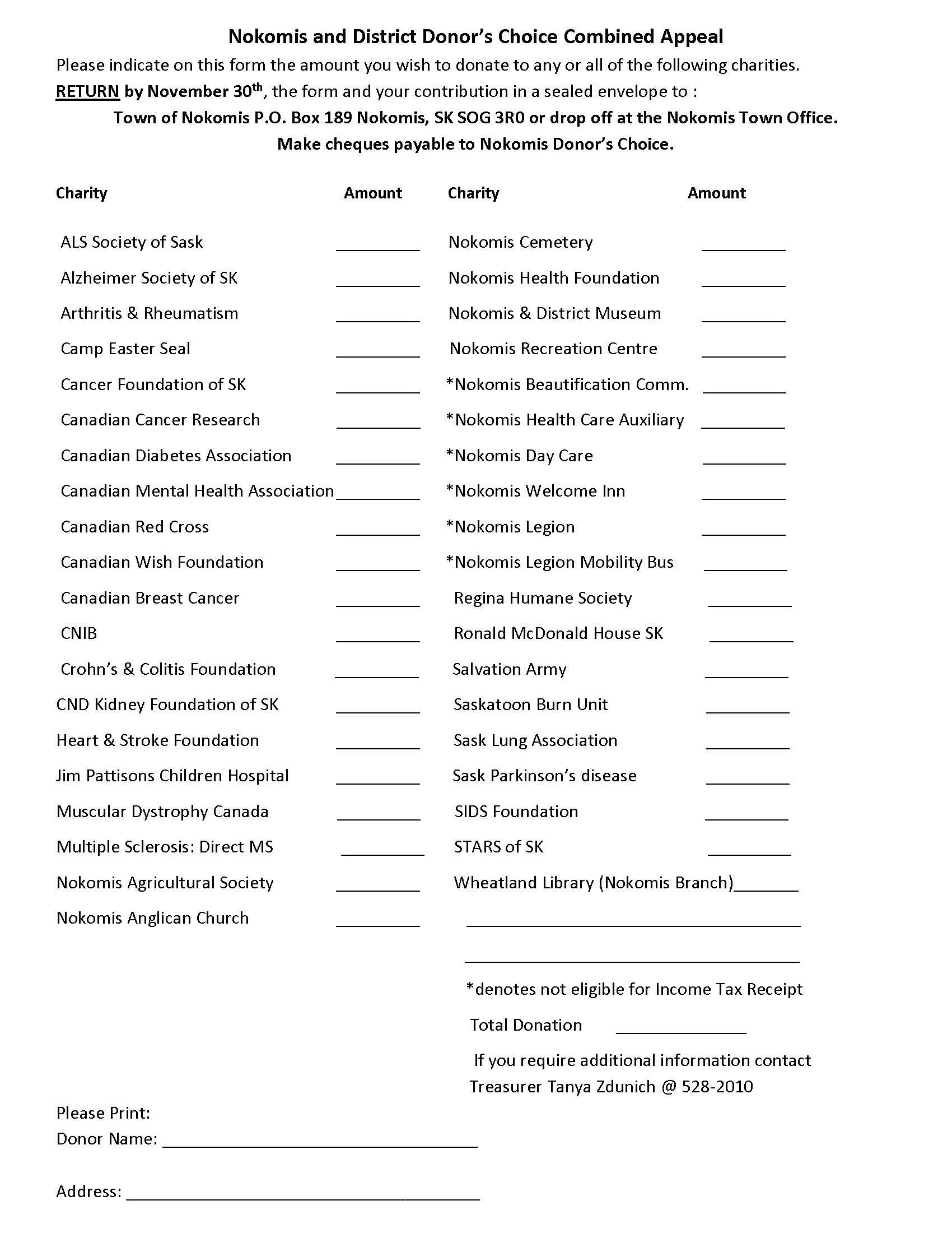 Nokomis and District Donor’s Choice Combined Appeal Oct 14 Written By Chad Cardiff Please click here to download the form below. Chad Cardiff